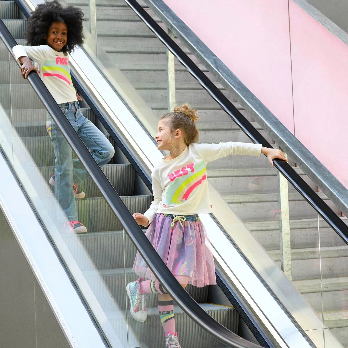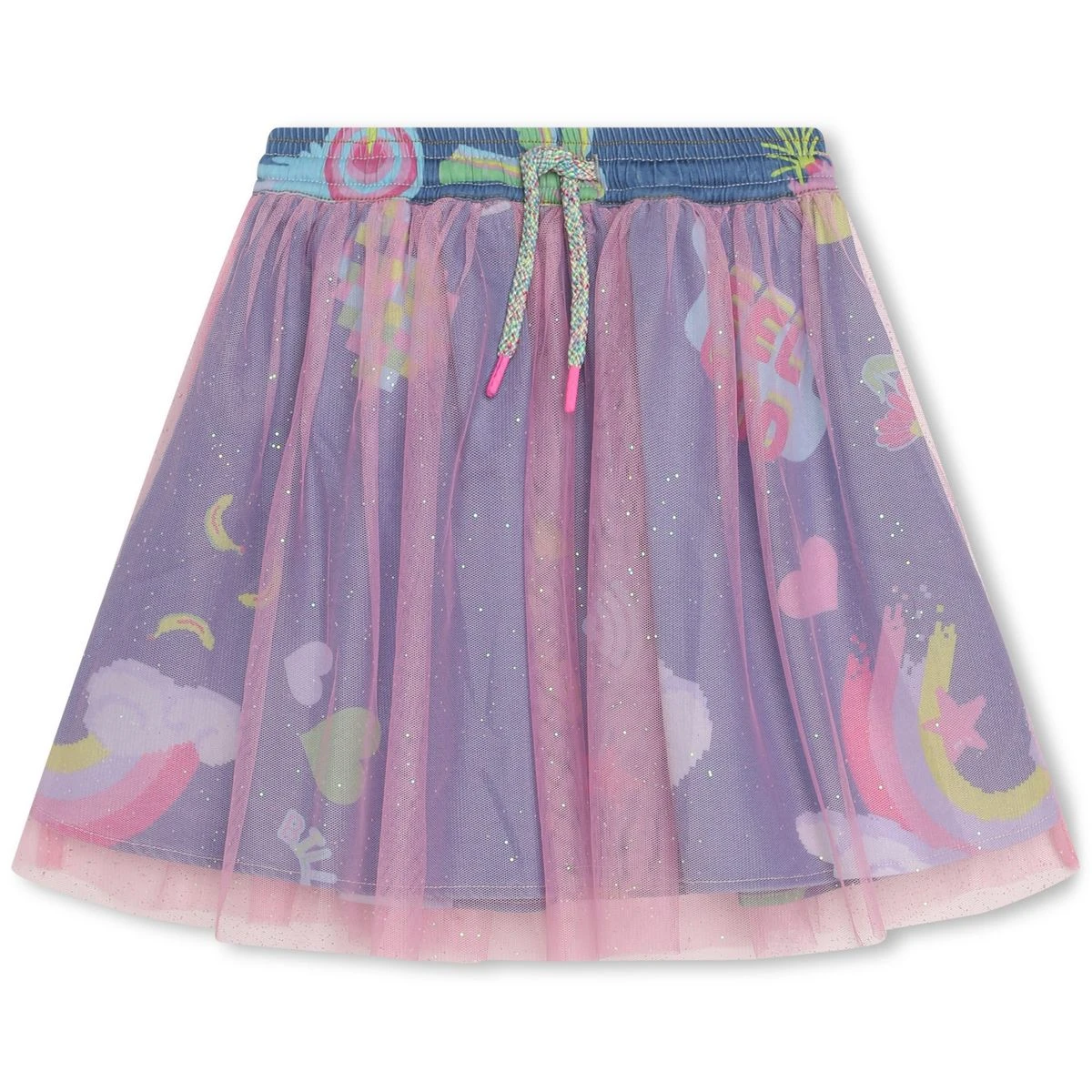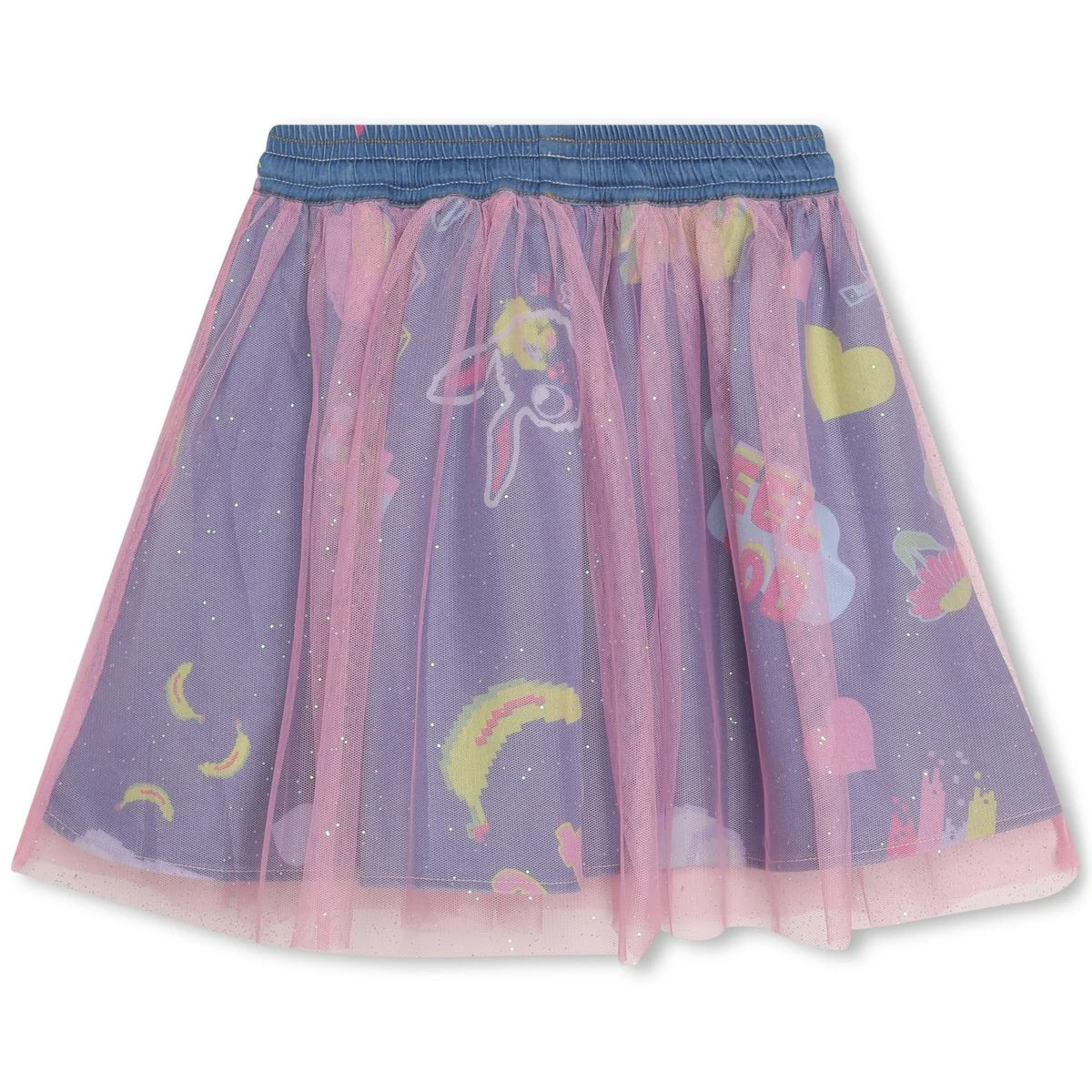 Cette jupe en jean Billieblush doit son originalité à son effet de superposition. La partie inférieure en denim est décorée d’imprimés « Monde imaginaire » et la partie supérieure est constituée de tulle pailleté. La taille élastiquée s’ajuste grâce à un cordon tissé multicolore.