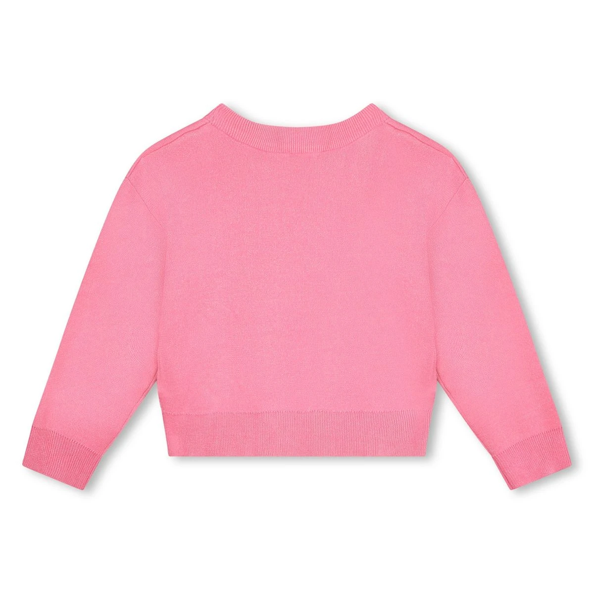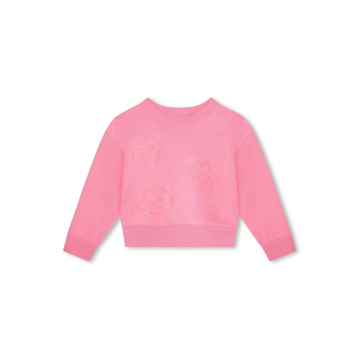 Ce pull pour fille Billieblush en tricot brillant est confectionné dans un mélange de coton et de viscose. Sur le devant se trouvent une étoile, un nuage et un coeur aux visages malicieux. Un bord-côte souligne l’encolure, les poignets et le bas.