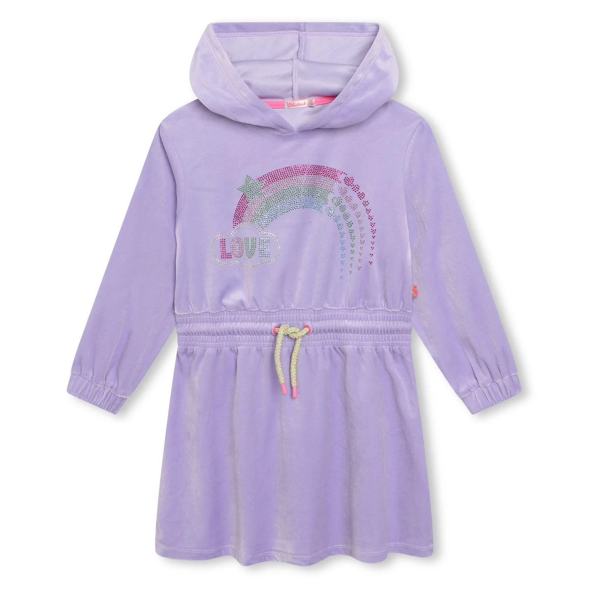 Cette robe en velours Billieblush affiche des motifs en strass multicolores devant. La taille élastiquée est associée à un cordon sous coulisse à nouer. Une étiquette rayée Billieblush orne le côté de ce modèle à capuche.