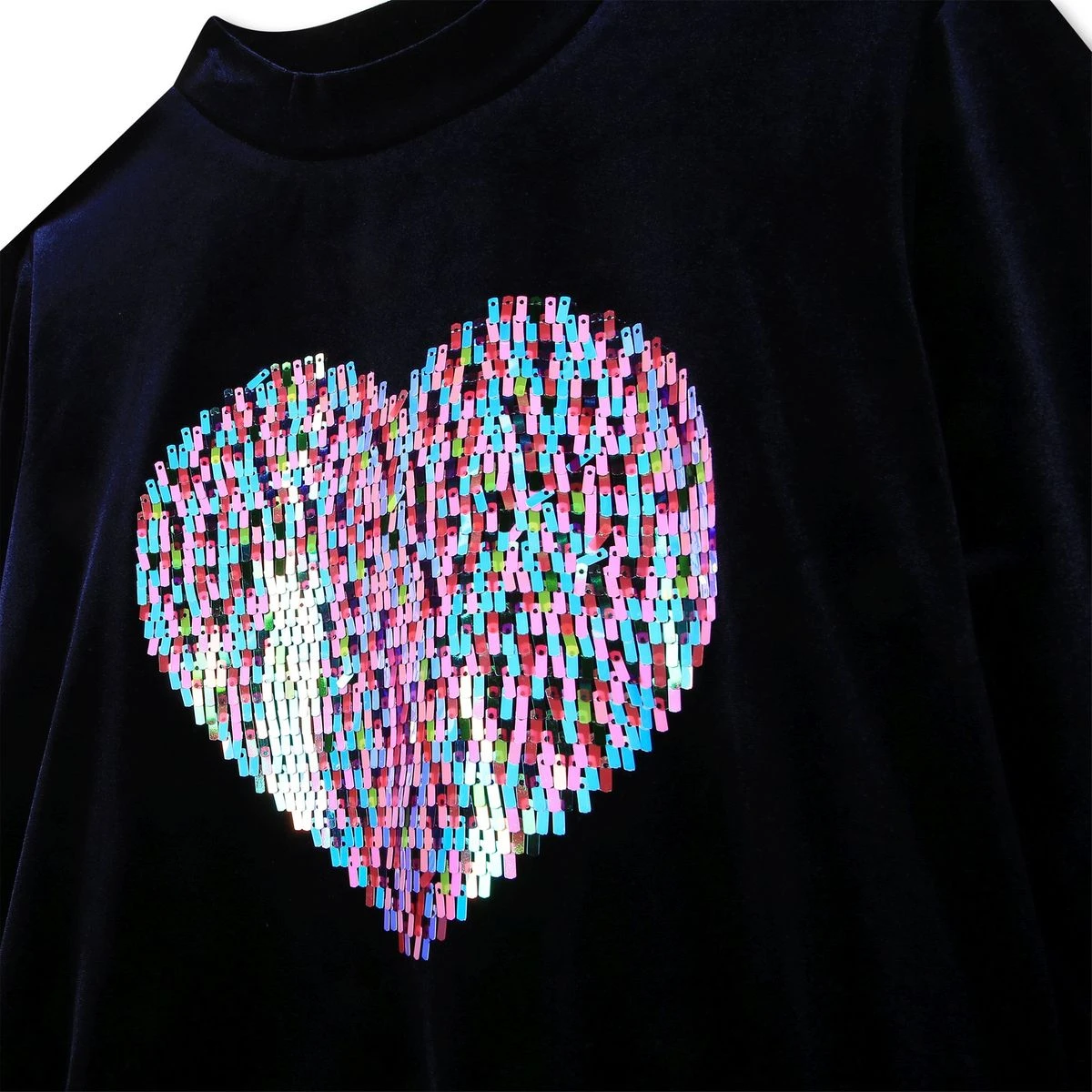 Cette robe à manches longues Billieblush est confectionnée en velours ras. Ce modèle à la taille basse élastiquée arbore un coeur en sequins rectangulaires multicolores devant. Un élastique plat au jacquard Billieblush constitue les poignets. Le côté affiche une étiquette rayée Billieblush cousue.