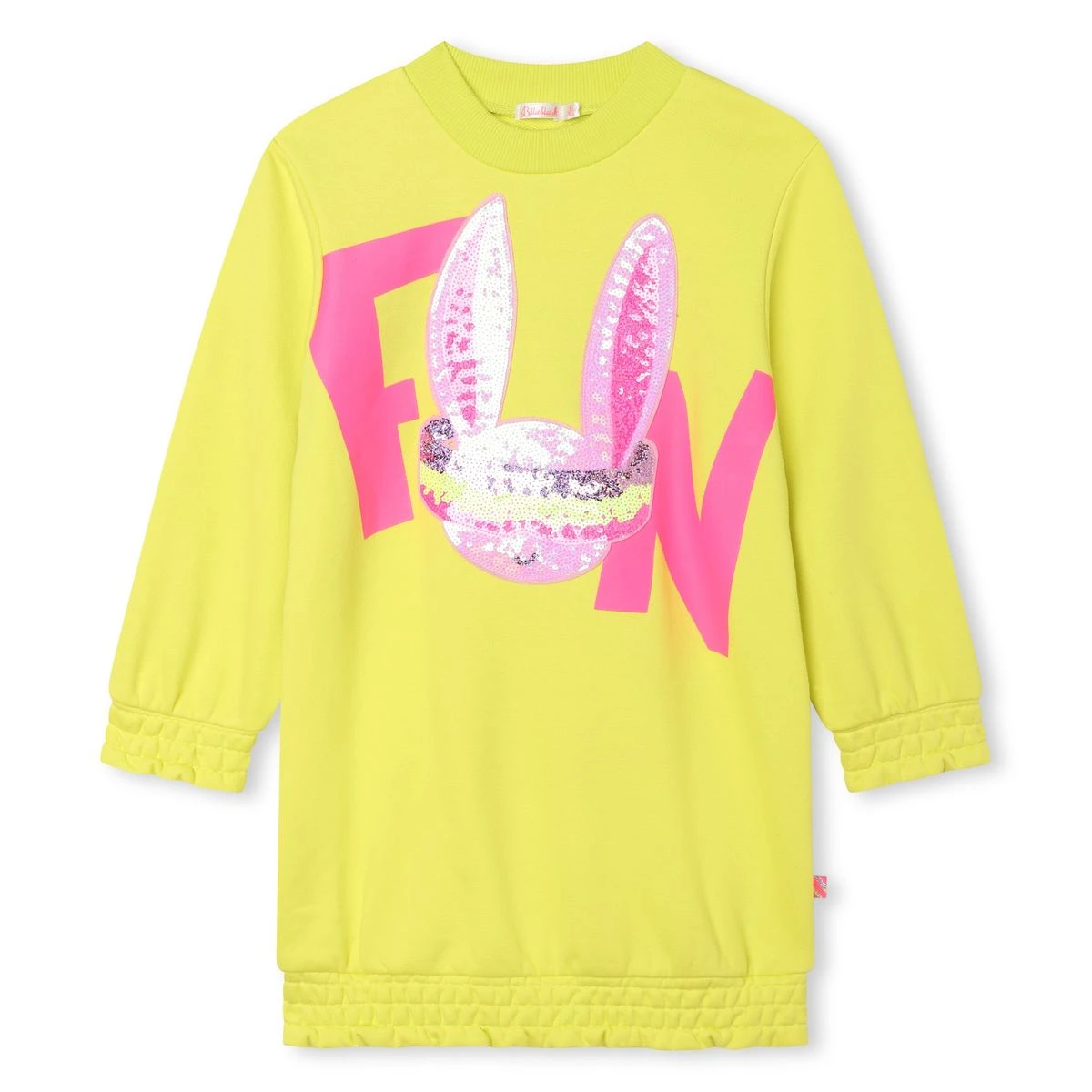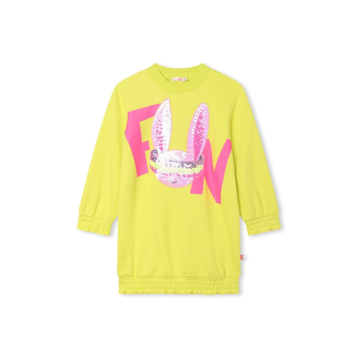 Cette robe molletonnée Billieblush est confectionnée en coton majoritaire. Elle possède une coupe assez ample, avec un col rond en bord-côte et des manches longues terminées par des smocks. L’avant est décoré d’un message imprimé avec motif en sequins brodés.